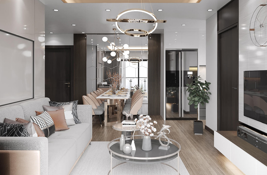 - Thẩm mỹ đồng nhất: Toàn bộ căn hộ có sự kết nối về màu sắc và chất liệu, tạo nên một tổng thể hài hòa và đẳng cấp.
